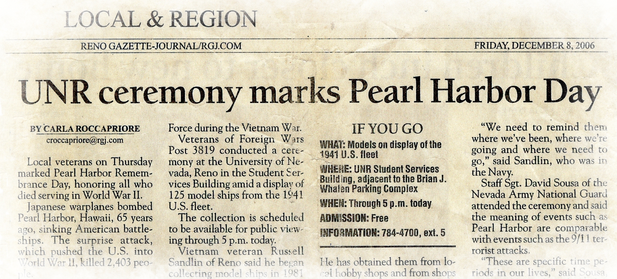December 7th 2006--University of Nevada RenoOfficial ceremony at the University of Nevada Reno. Members of Veterans of Foreign Wars Post #3819 tolled ship’s bell in remembrance of the men and ships lost on the 65th anniversary of the attack on Pearl Harbor. The exhibit of the US Fleet 1941 Recreation Project was held for two days. Joe Hart, anchorman, for channel 4 NBC reported the story on local news broadcast, before the NBC national broadcast of the Remembrance Ceremony at the Pearl Harbor Visitors Center in Hawaii. Brian Williams anchored the news broadcast, and Tom Brocaw covered the ceremony. The Reno Gazette Journal newspaper covered the local event in Reno, Nevada.