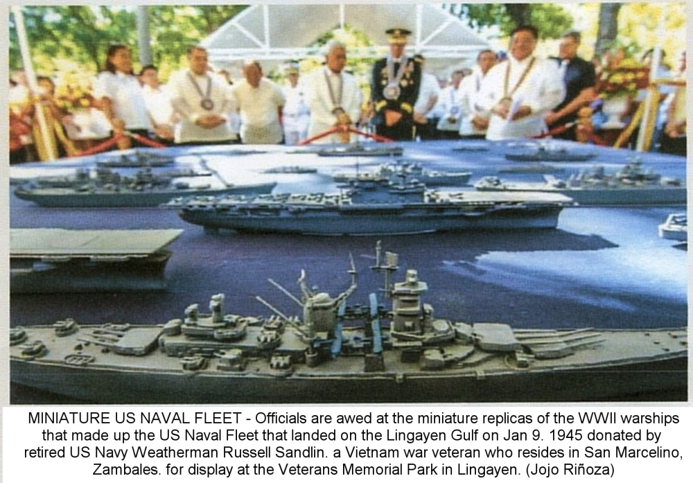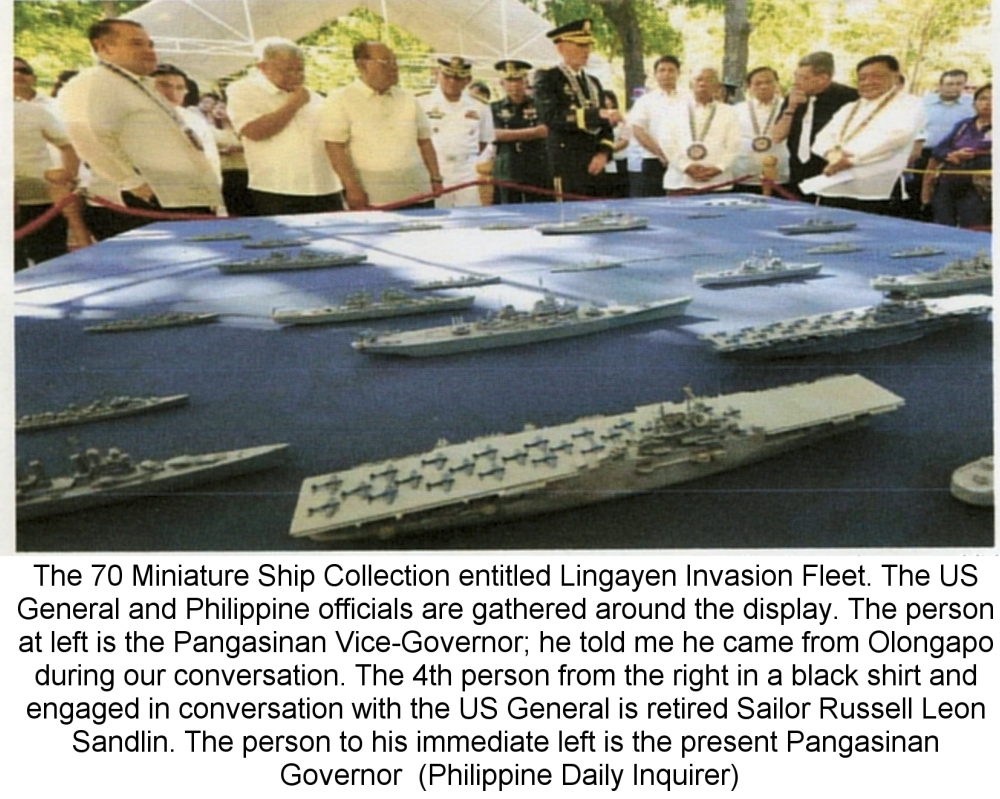 70th Anniversary Commemoration of MacArthur's return to Luzon at Lingayen, Province of Pangasinan, Philippines. The event took place at MacArthur's Memorial Park with a Ceremony and Banquet. Honored the memory of Russell Sandlin's grandfather "Oscar Rogez", and Oscar's brother, great uncle "Henry Rogez", who participated in that invasion on January 9th 1945. As part of the ceremony, 70 ship models were oficially donated, exhibited on October 20th 2014 at Magellan's Museum, to the MacArthur's Memorial Park. The Governor of Pangasinan received the donation and presented Mr. Sandlin with a letter of acceptance. A copy of the DVD "Victory at Sea, Return to the Philippines" was presented . The video was shown on Big Screen to all attending the Banquet. The story was covered by ABS-CBN Channel 2, GMA 7, as well as the Manila Bulletin and the Philippine Daily Inquirer newspapers.